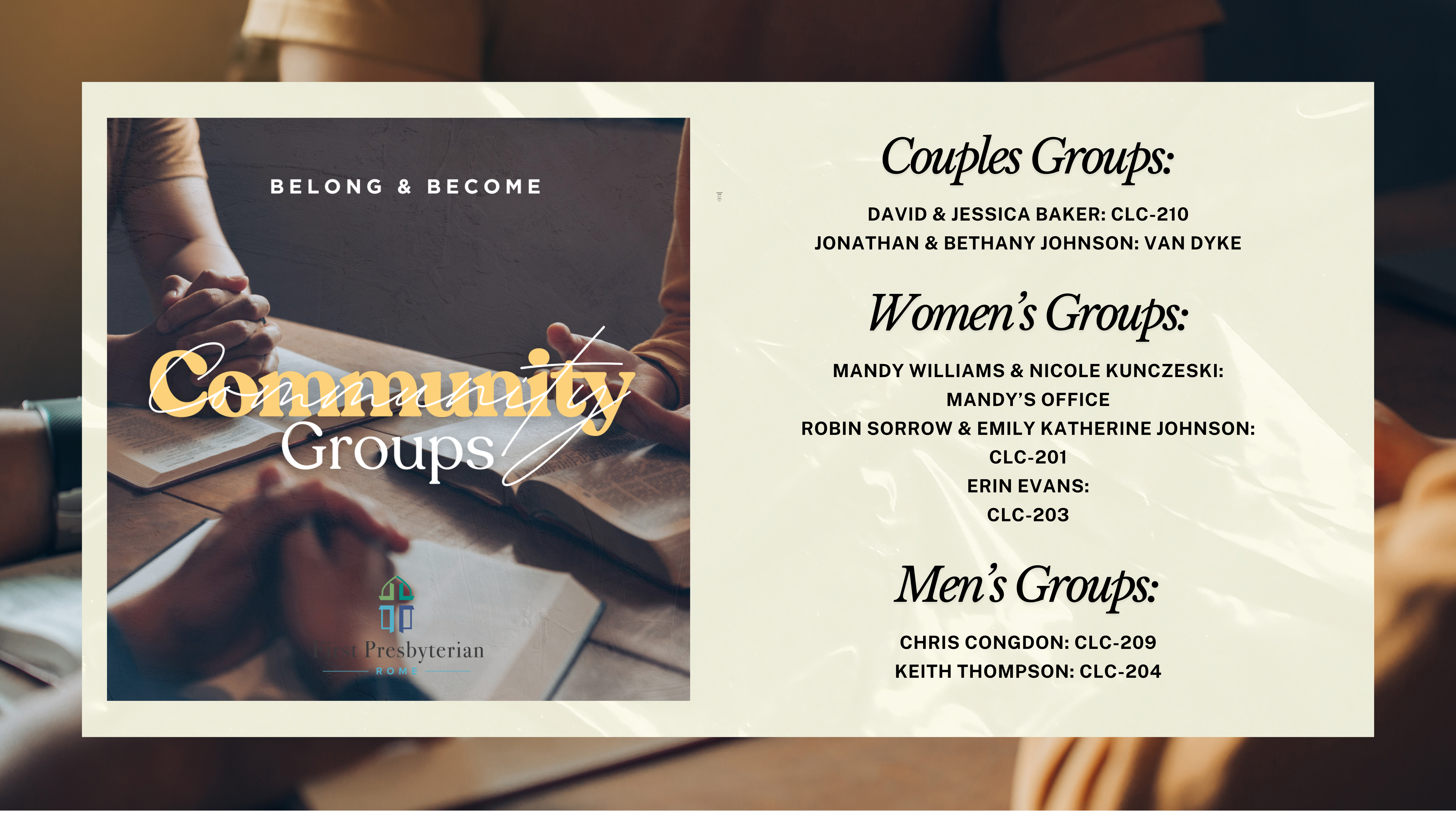It’s a place to Belong and Become. Community Groups are small groups of FPC Rome members and visitors who meet regularly to experience true fellowship: learning and praying together, knowing and connecting the Gospel with each other’s real lives, and emphasizing a missional connection with others in the greater Rome community.
