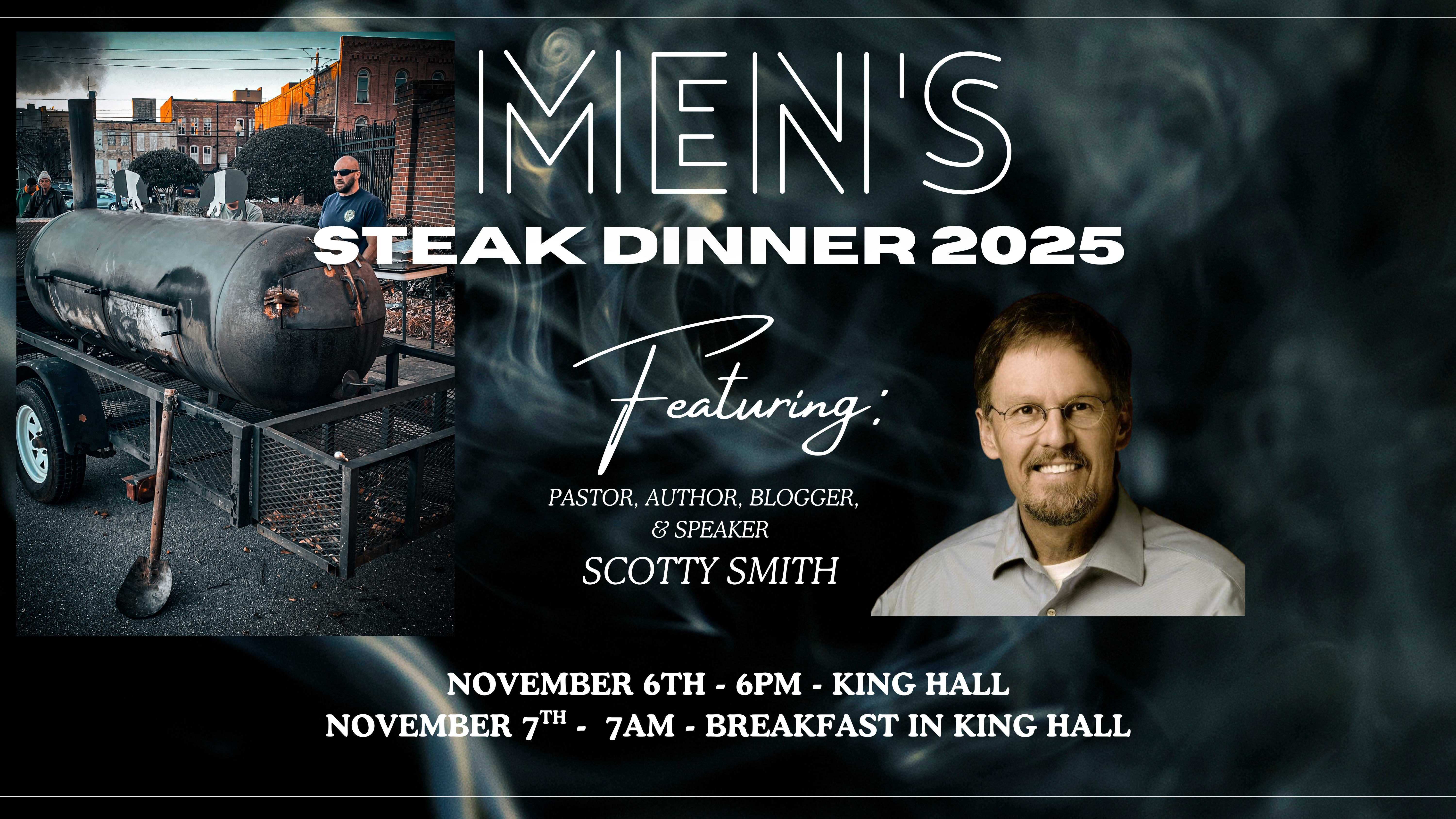 Men of the Church, Your Men’s Ministry team would like to invite you to come together for our annual Steak Night Event. We are excited to share that Pastor, Author, Blogger and Speaker, Scotty Smith, will join us on November 6th at 6 PM and on November 7th at 7 AM for breakfast in King Hall.
